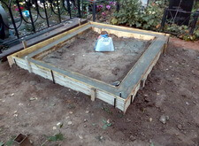 Следующим этапом стали внутренние работы: мы собрали цветник, укрепили основание для памятника и подставку под вазу. Остальную территорию участка застелили геотектстилем, который будет препятствовать прорастанию травы сквозь брусчатку. К сожалению, в разгар работы нас застиг дождь, а потому участок пришлось накрыть тентом.