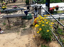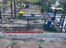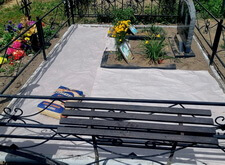 Подготовленную почву застелили геотекстилем, который будет препятствовать проростанию сорной травы в плиточных швах. В это же время на территории могилы были дополнительно установлены лавочка и столик.
