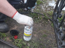 Сначала мы обезжириваем ограждение, затем укрываем этот и соседние участки специальной тканью, защищающей территорию от попадания краски и искр.
