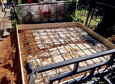 Первым делом мы демонтируем памятник, цветник, снимаем оградку, разламываем прилегающую к дорожке бетонную полосу. Затем выставляем опалубку по периметру участка.